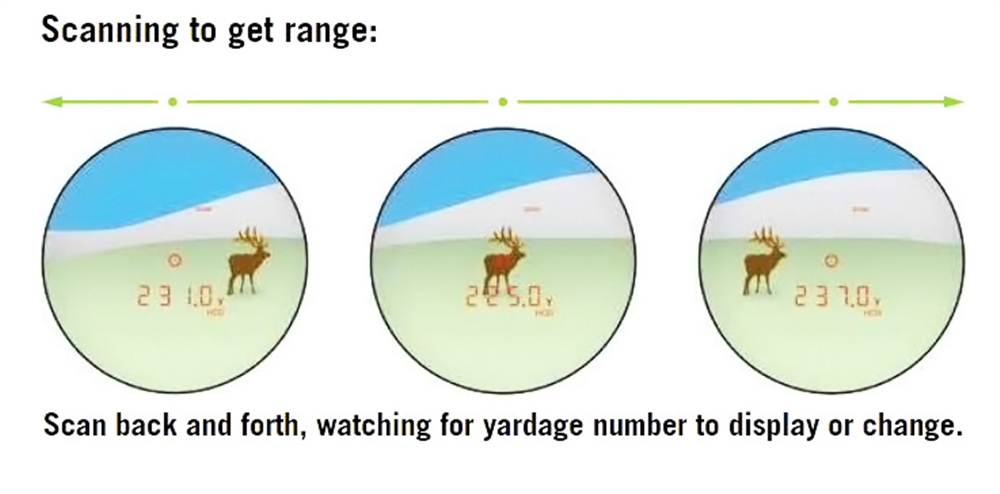 Tretji način merjenja je Scan Mode. Gre za neprestano oz. kontinuirano izpisovanje razdalj. Pri tem se vam ni potrebno osredotočiti na en sam cilj, je pa ta način izjemno priročen pri sledenju premikajočih živali.