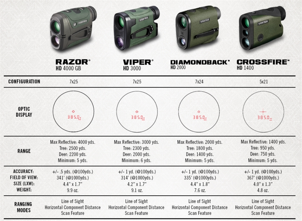 Podjetje nenehno posodablja ponudbo laserskih daljinomerov, zato se dobro prepričajte kateri model je pravi za vas. Vortex 2000 HD je za odtenek dražji od najcenejše serije daljinomerov Crossfire, na katero prisegajo predvsem lovci na divje svinje.