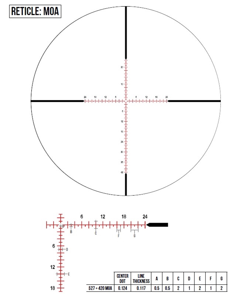 Vrhi kupol so nabrazdani za lažji oprijem, vse črtice pa so označene s kontrastno belo barvo za lažjo orientacijo in pravilno štetje klikov v stresni situaciji. Korak nastavitve križa je 0.1 MIL, kar zagotavlja natančnost pri strelu na dolge razdalje. Paralaksa je nastavljiva od 15 metrov do neskončnosti.