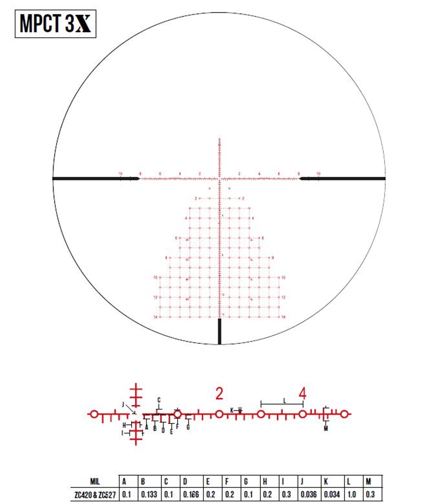 Križ MPCT3X je združuje elemente MPCT1 in MPCT2, vendar ima tudi povsem svoje odlike. Delo z MPCT3X je hitro in natančno. Zgornja polovica namerilnega križa je skoraj popolnoma brez črt (vertikala se dvigne le do 0,4 MIL). Spodnja polovica ima inovativen mrežasti vzorec pik v razmiku 0,2 MIL.