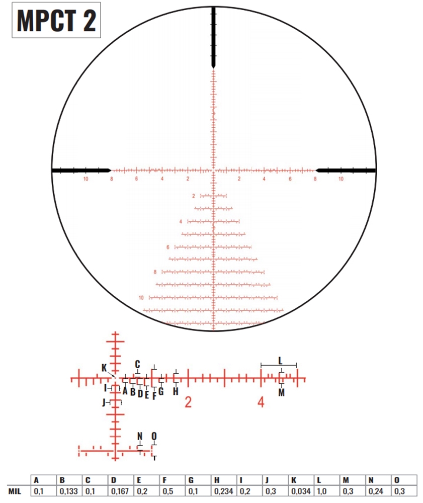 Druga izbira je namerilni križ MPCT2 v tipični obliki jelke, ki je priljubljen zlasti med tekmovalnimi strelci. Razmik med črticami je povsod 0,2 MIL, zato je računanje klikov hitro in enostavno.