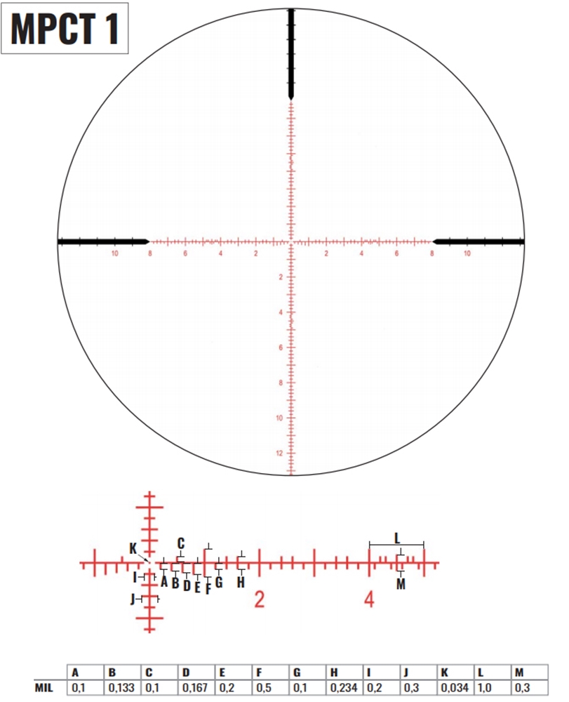 Namerilni križ MPCT1 je najboljša izbira za strelce, ki želijo enostaven MIL križ s čistimi linijami. Če vas zanima tudi neposredna okolica tarče, je namerilni križ MPCT1 zagotovo prava izbira. Prekrivanje s tarčo je minimalno, natančno poravnavo pa zagotavlja plavajoča pika na sredini.